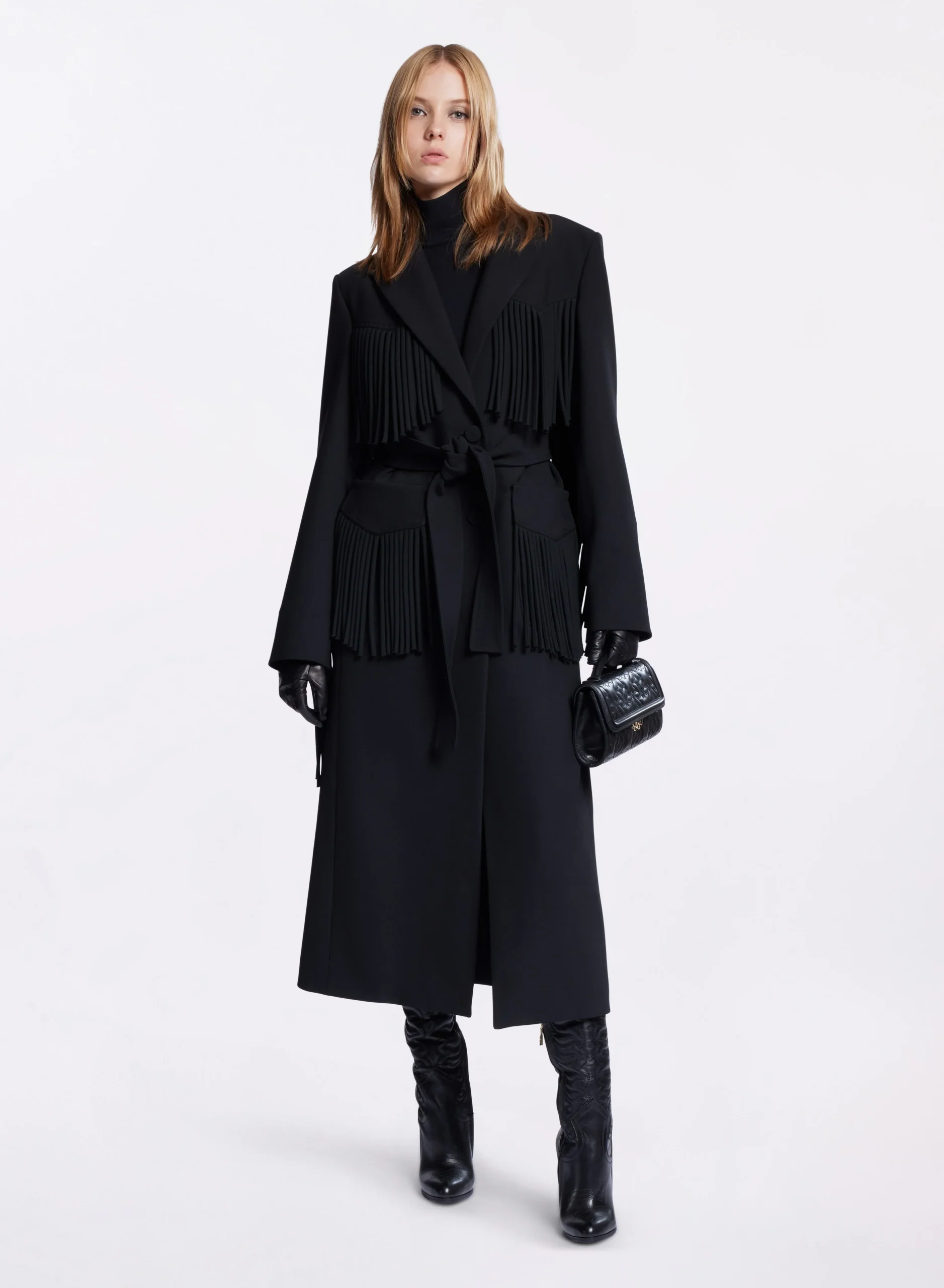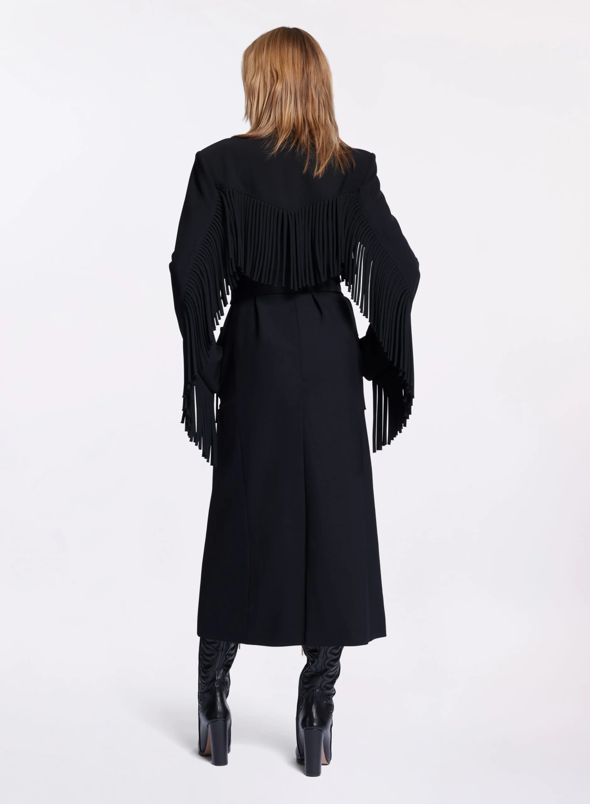 Playful fringes swish and sway down the front and along the sleeves of this Black coat, adding a touch of Rodeo Glam to its buttoned front and belted midi silhouette.
